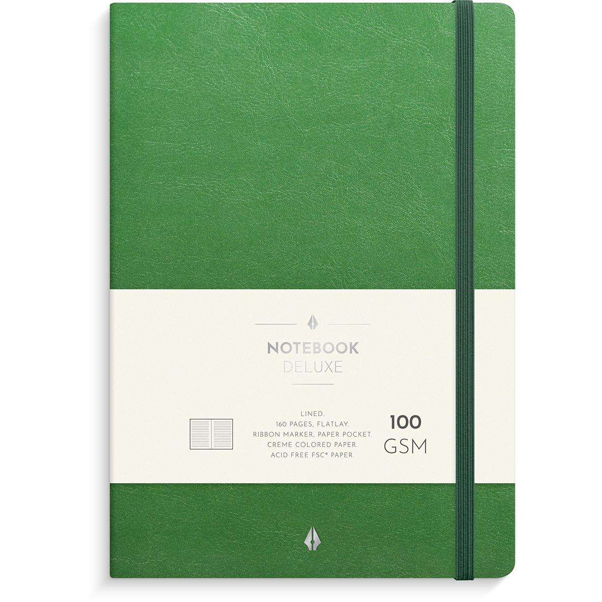 Ge dina idéer, drömmar och planer en plats att växa i Notebook Deluxe Green – en elegant anteckningsbok med ett mjukt mossgrönt omslag i konstläder. Den inbundna designen gör att boken ligger plant när den är uppslagen, vilket ger en bekväm och smidig skrivupplevelse.